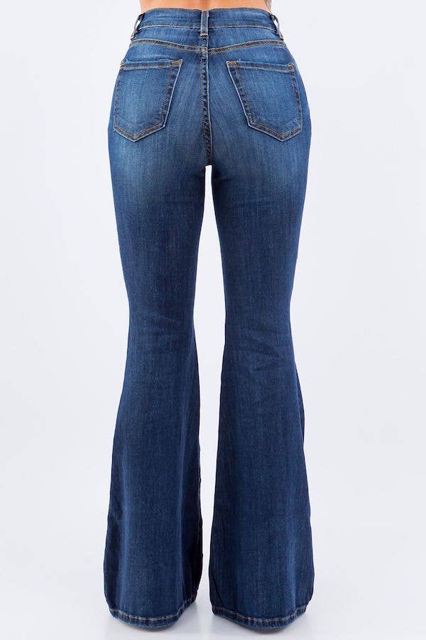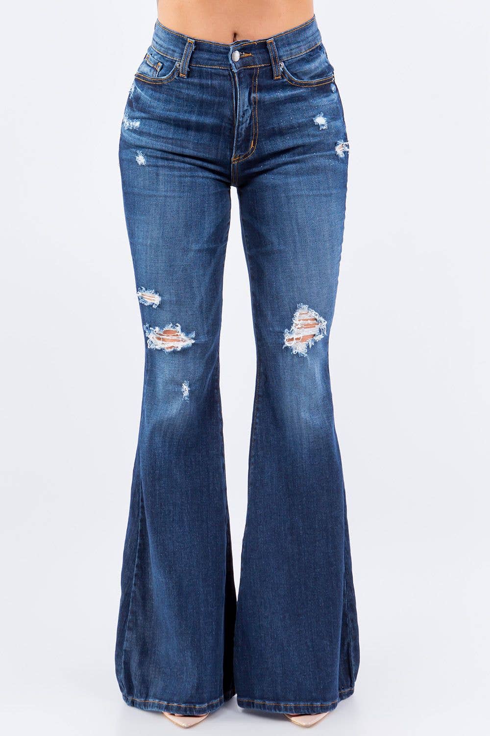 Full Length 5 Pocket Bell Bottom Jean features ripped detail, front and back pockets, front button and zipper closure, stone wash detail, 11" Rise, 34" Inseam, Made In USA