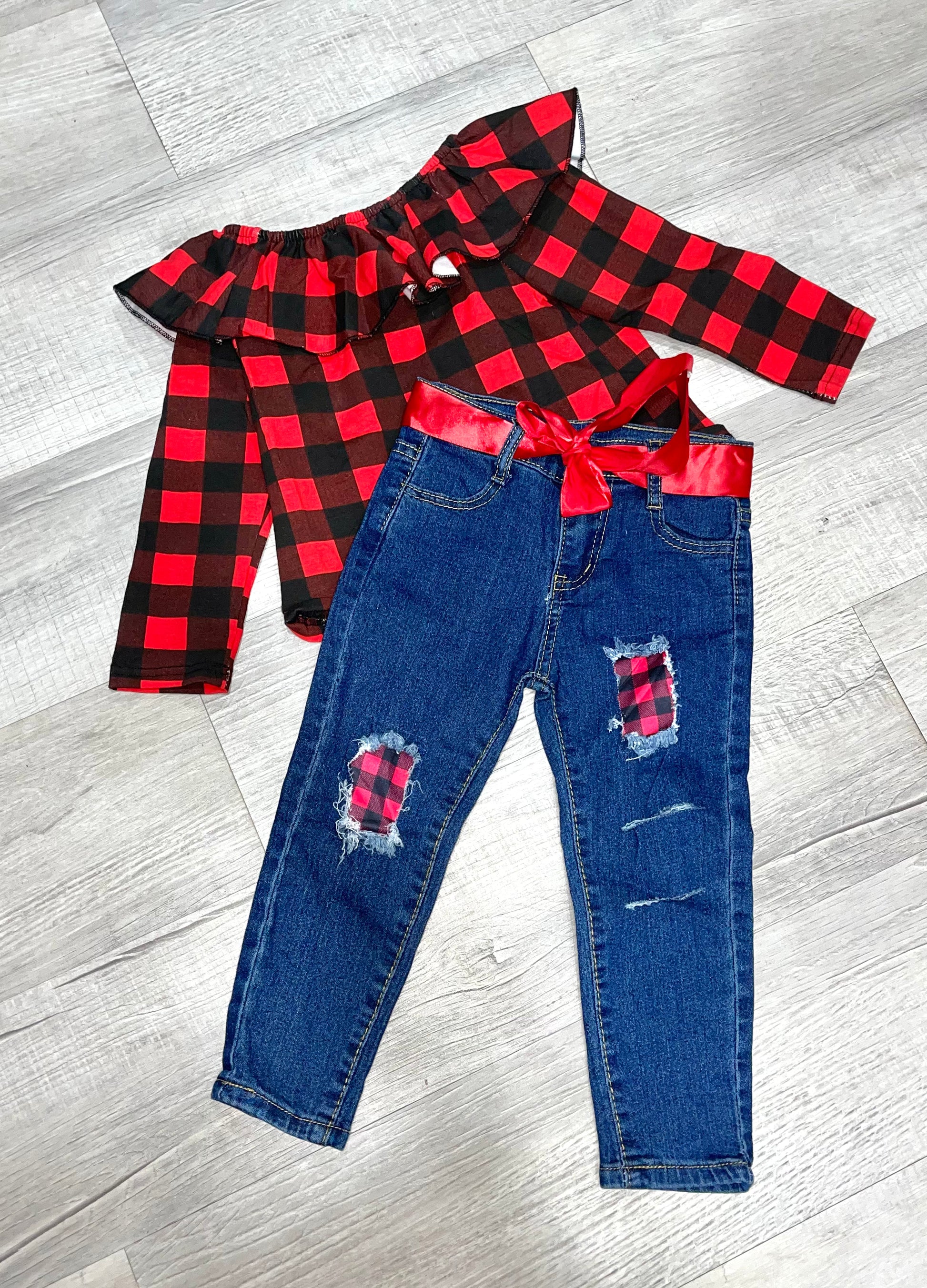 Buffalo Plaid top with distressed jeans with buffalo plaid insert.
