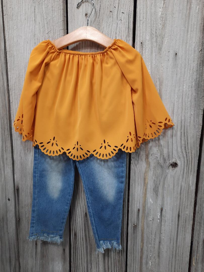 Mustard Lae Top with Faded Raw Hem Jeans.