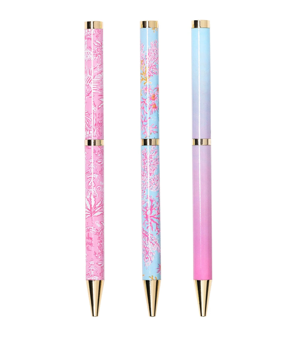 Jot down your next great idea or packing list with this set of 3 pens in assorted lilly patterns with black ink.