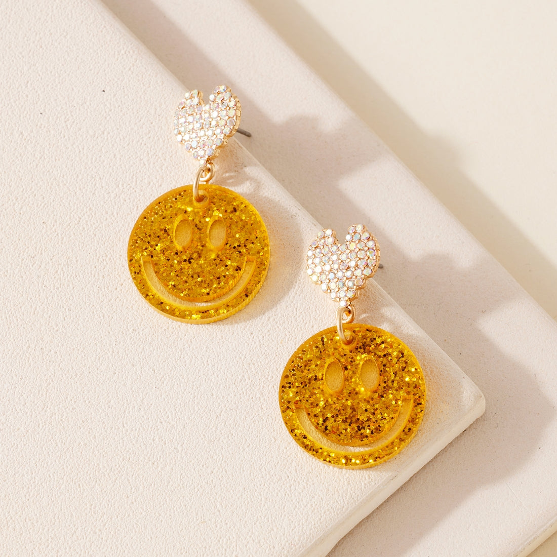 Smiley face shaped dangling earrings with rhinestone heart post and glitter detail.