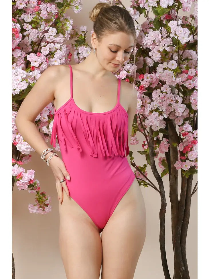 Solid fabric, fringed camisole style body-con bodysuit. Model wear S. Model: 5'8" 36-24-39.