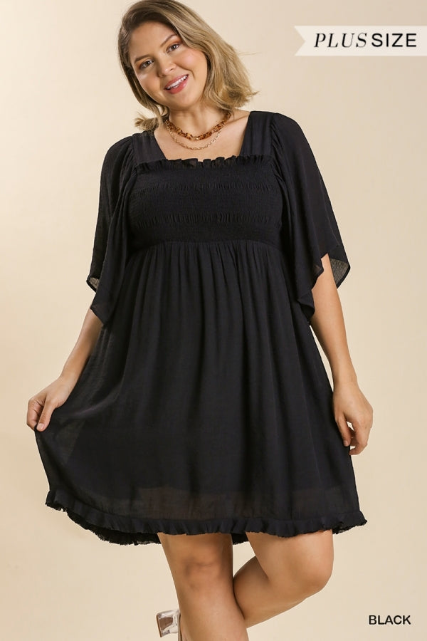 Black Square Neckline Short Bell Sleeve Smocking Bodice Dress with Raw Hem and Lining